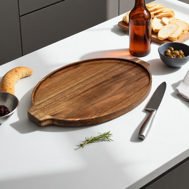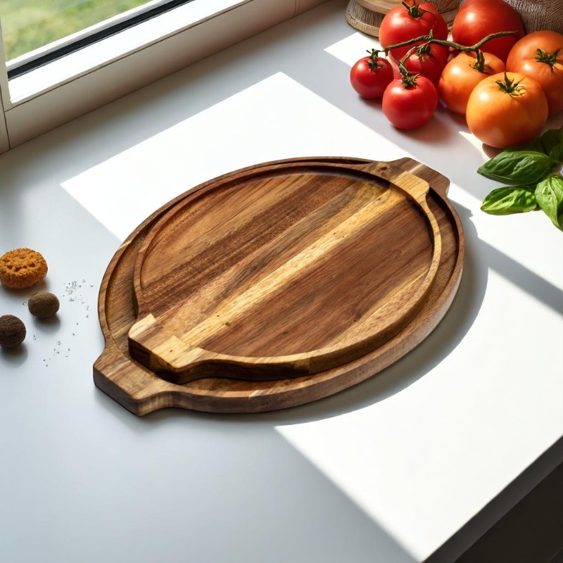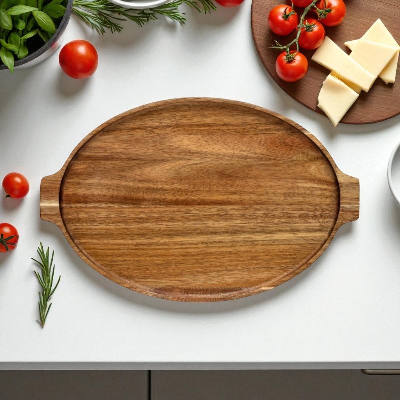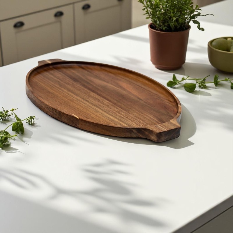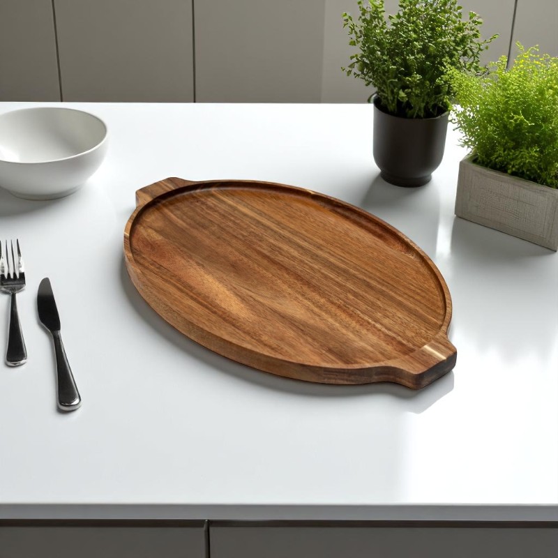 Υπέροχο οβάλ πιάτο, από 100% ακακίας. Ξεχωρίζει όχι μόνο για το σχήμα του, αλλά και για το γλυκό του σκούρο χρώμα και τα ιδιαίτερα «νερά», σαν πλεξούδες. Γεύσου άφοβα κρύες και μαγειρευτές τροφές στην επιφάνειά του, όπως Burger, Club Sandwich, ποικιλίες κρεατικών, μερίδες.