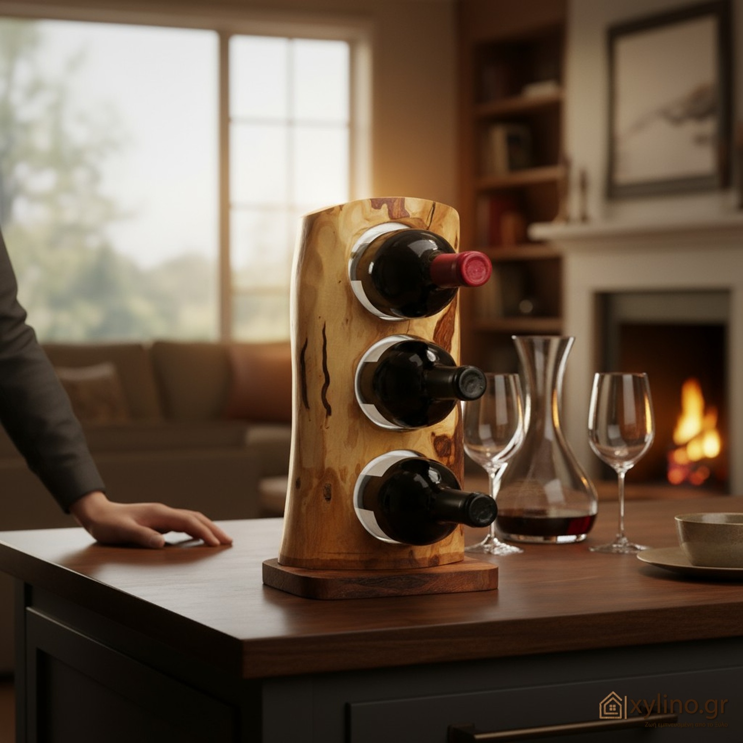Πραγματικά one-of-a-kind ξύλινο σταντ για κρασί για 3 θέσεις που θα σου φτιάξει τη διάθεση. Αποθήκευσε μέχρι το άνοιγμά του το αγαπημένο σου μπουκάλι κρασί στην προσωπική σου χειροποίητη μίνι κάβα. Θα σε ενθουσιάσει η σχεδίασή του, η οργανική του προσωπικότητα καθώς και τα φυσικά του νερά κι οι αποχρώσεις της Ελιάς.