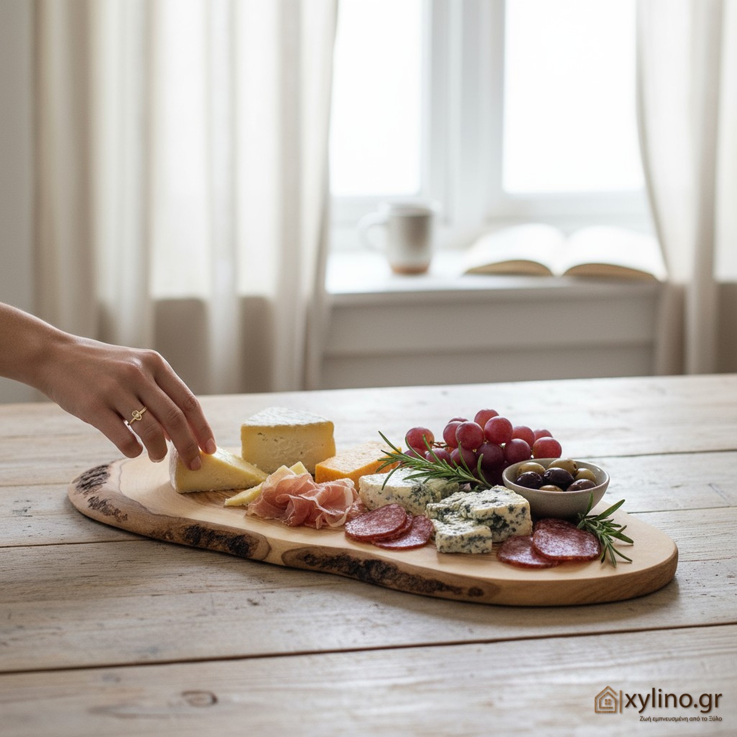 Κρατάς στα χέρια σου ένα ζωντανό κομμάτι ξύλου σε αυτή την χειροποίητη επιφάνεια κοπής και σερβιρίσματος. Ακόμη έχει επάνω του το κλαδί ελιάς από όπου προέρχεται και ιδιαίτερους δακτυλίους στην καρδιά του. Πώς να μη σε συγκινήσει… Όσο για το τελείωμα, στο πάχος του, θα παρατηρήσεις μέρος από τον φλοιό της Ελιάς! Φιλοσοφία ζωής κι αισθητική επιλογή.